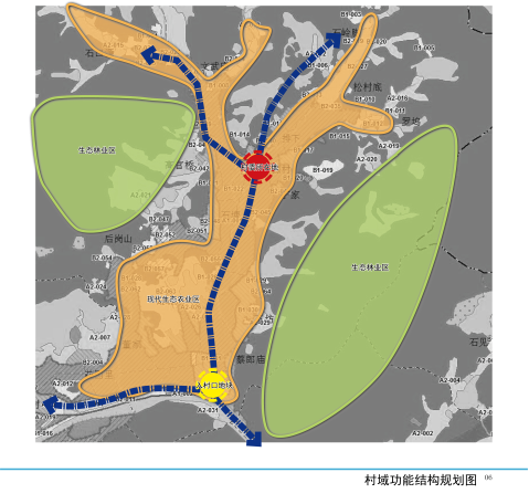 村域規(guī)劃結(jié)構(gòu):規(guī)劃形成“一心、兩帶、三區(qū)”的空間結(jié)構(gòu)體系。