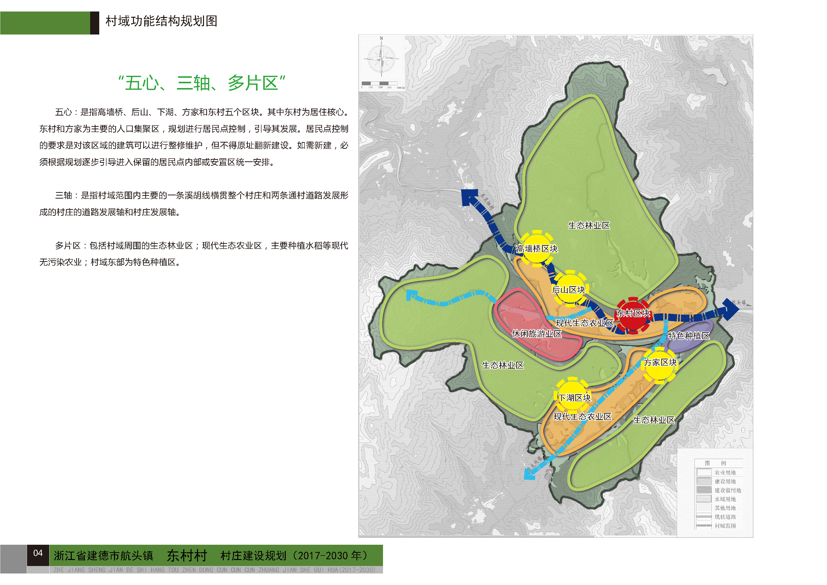 村域規(guī)劃結(jié)構(gòu):規(guī)劃形成“五心、三軸、多片區(qū)”的空間結(jié)構(gòu)體系。
