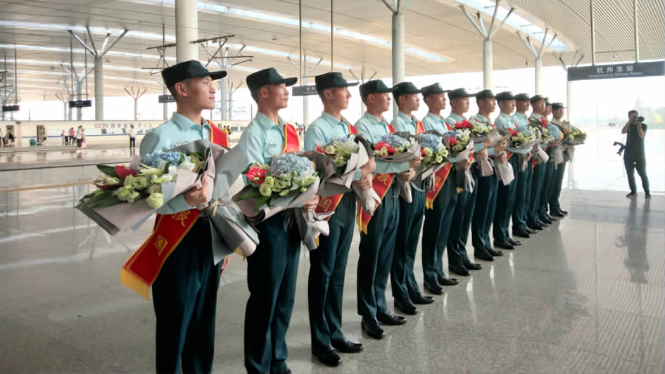 當(dāng)天下午3點35分,隨著G31次列車駛?cè)牒贾輺|站,13位參加閱兵式的隊員們依次下車??匆娬煞驓W陽哲的那一刻,金鑫和丈夫緊緊擁抱。一句“老公,你辛苦了!”飽含了這半年的思念。