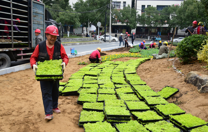 連日來(lái),在新安江城區(qū)府前路舊城改造建設(shè)工地,30多名工人正在對(duì)新安路與白沙路交叉口路段栽種三色堇、佛甲草、 羽衣甘藍(lán)等花草。