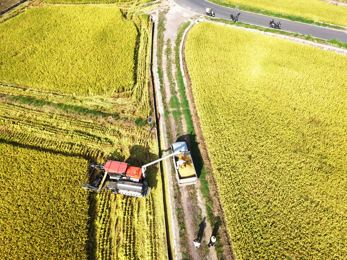 眼下,我市8萬(wàn)畝單季晚稻喜獲豐收,預(yù)計(jì)平均畝產(chǎn)約600公斤。圖為杭州山峰農(nóng)業(yè)開(kāi)發(fā)有限公司組織農(nóng)機(jī)手采收壽昌鎮(zhèn)山峰村高田畈自然村的280畝單季晚稻。