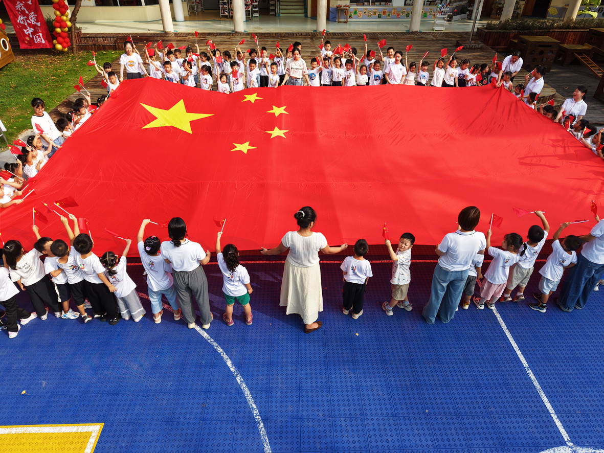 9月29日,市機(jī)關(guān)幼兒園開展“我與國旗合個(gè)影”慶祝中華人民共和國成立76周年愛國主義教育活動(dòng)。孩子們?cè)诶蠋煹膸ьI(lǐng)下,圍繞在一面巨型國旗旁,祝福祖國媽媽生日快樂。