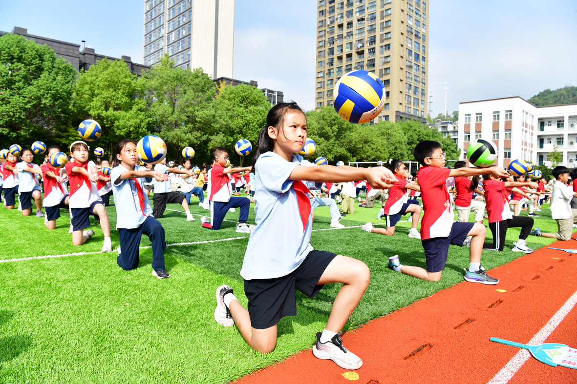 10月15日,在市實驗小學(xué)開展的大課間上,學(xué)生們整齊有序地在操場上跟隨著音樂節(jié)奏練習(xí)排球操。近年來,該校把排球項目作為“一校一品”的特色文體教學(xué)項目,積極鼓勵學(xué)生參加排球運動,發(fā)揚“團(tuán)結(jié)協(xié)作、頑強拼搏”的精神,讓學(xué)生在體育運動中強健體魄、展示特長。