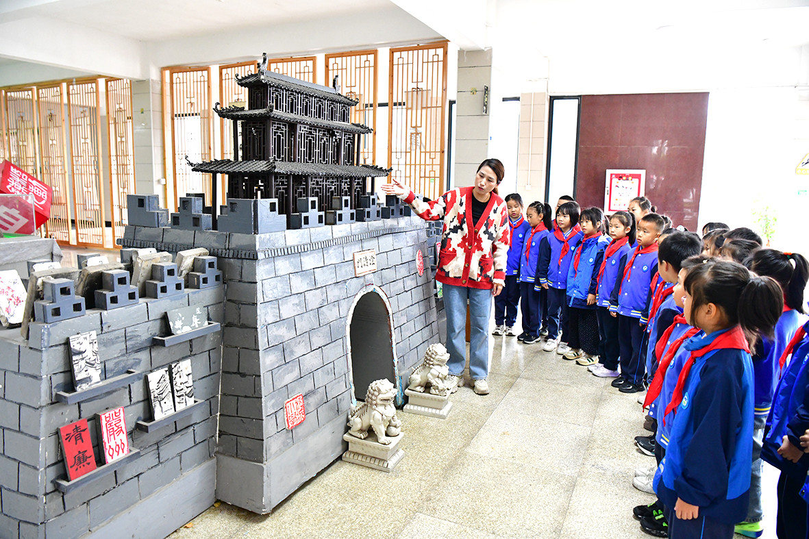 11月4日,在梅城中心小學(xué)清廉教育基地,老師向?qū)W生們講解嚴州古城澄清門的清廉故事。據(jù)悉,該校美術(shù)組的教師們利用泡沫塑料及廢舊材料制作澄清門模型,并增添有關(guān)清廉知識的繪畫、文字等用于清廉教育,讓學(xué)生在學(xué)習(xí)、生活中培養(yǎng)廉潔自律的高尚品質(zhì)。