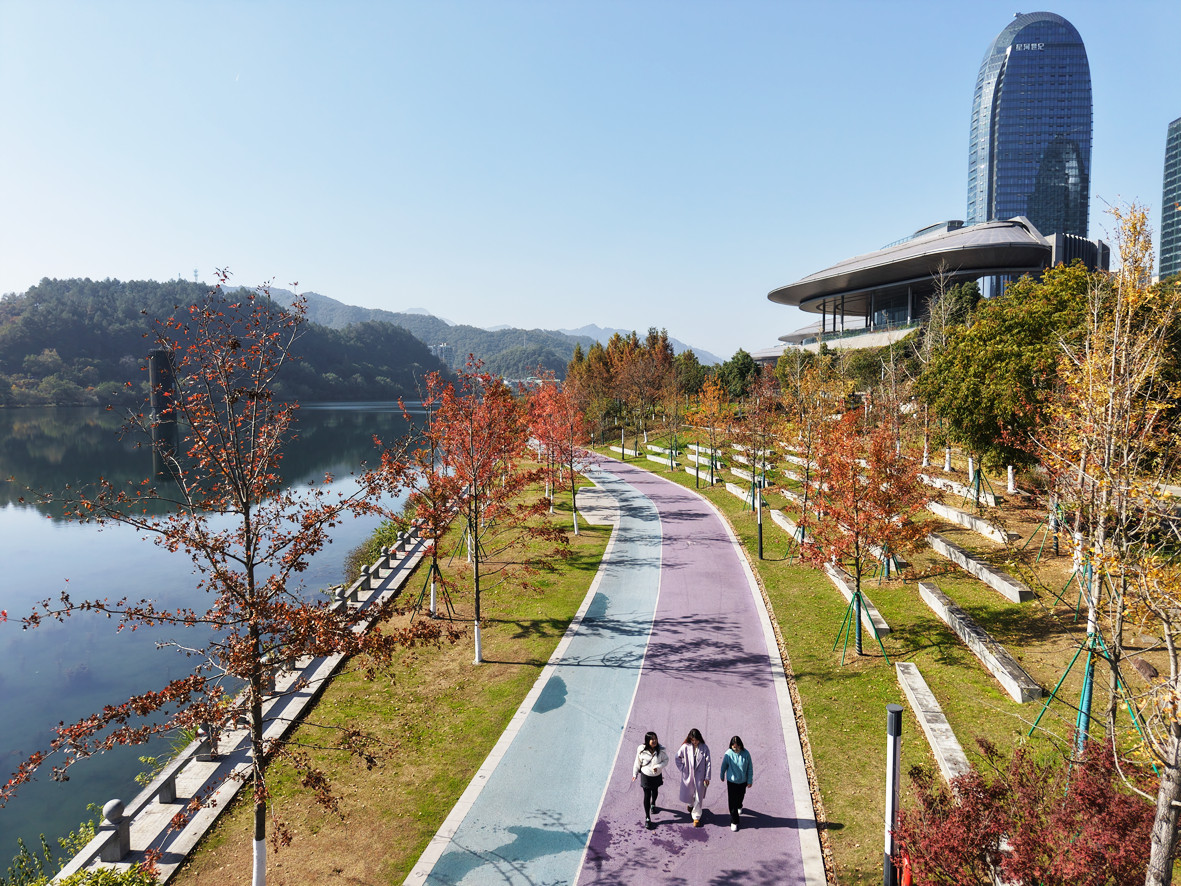 初冬時(shí)節(jié),新安江城區(qū)的江濱公園層林盡染,楓樹、銀杏樹、榔樹、烏桕等綠化樹種色彩斑斕,與城市綠道、建筑共同構(gòu)成了一幅人與自然和諧共生的美麗景致。