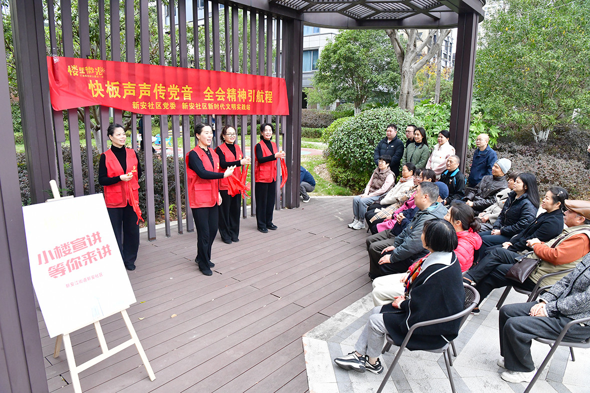 近日,新安江街道新安社區(qū)組織宣講隊伍通過快板、三句半、家常話等群眾喜聞樂見的形式宣講貫徹黨的二十屆四中全會精神,用身邊事闡釋政策要點和發(fā)展藍圖,讓全會精神走進群眾心間。圖為社區(qū)黨員文宣隊志愿者利用快板說唱形式,向社區(qū)黨員干部、樓棟紅管家、網(wǎng)格員宣講黨的二十屆四中全會精神。