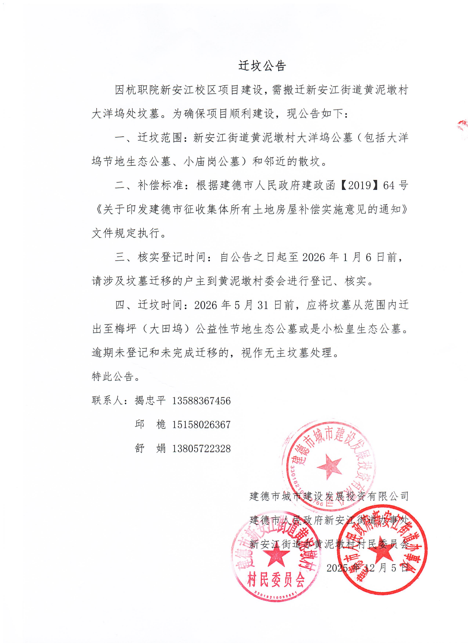 新安江街道黃泥墩村大洋塢處墳墓遷墳公告